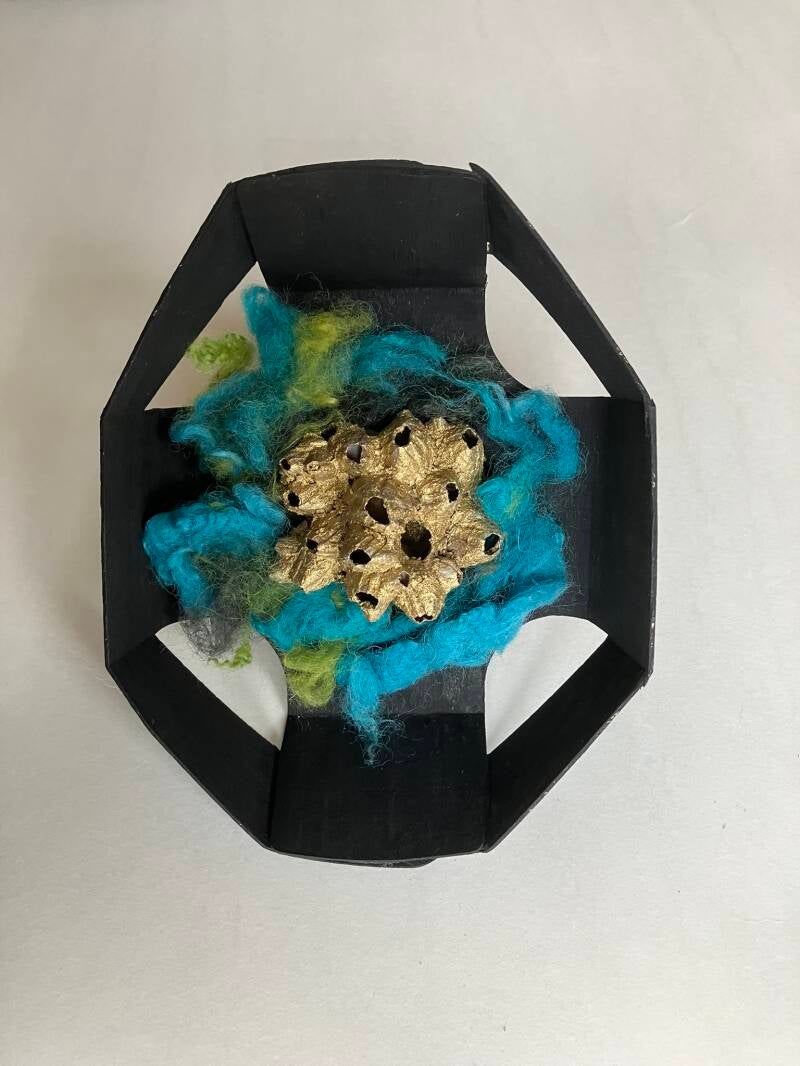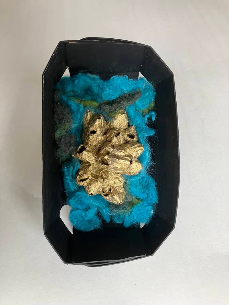 Gebruikte materialen: strandvondst, goudverf, wol.