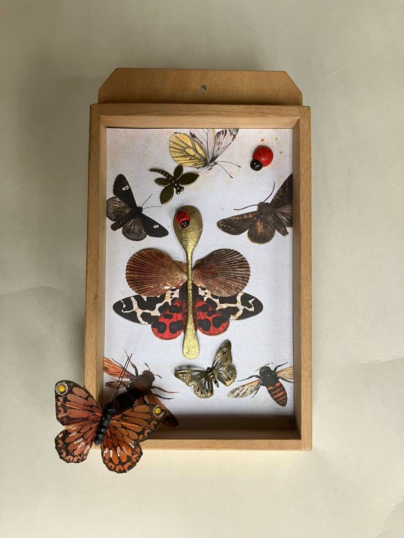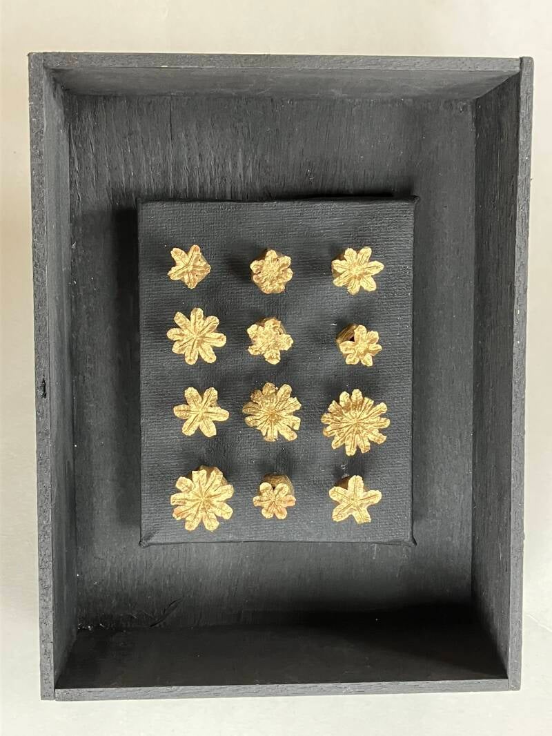 Gebruikte materialen: kistje, zaaddoosjes, goudverf.