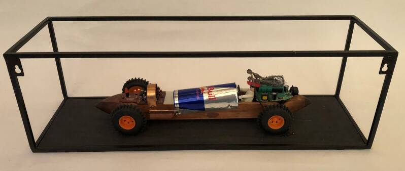 Gebruikte materialen: weefspoel, blik, wielen, printplaat, koper, ijzer.