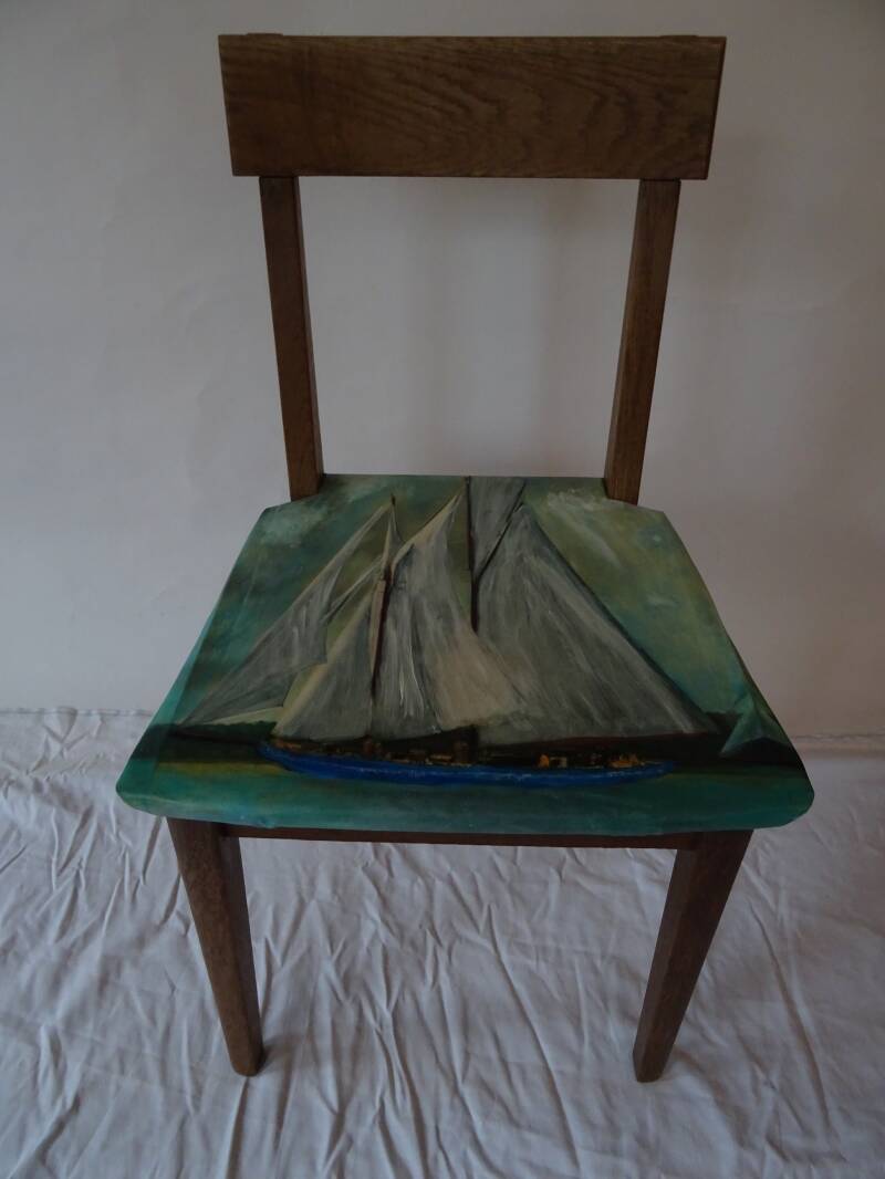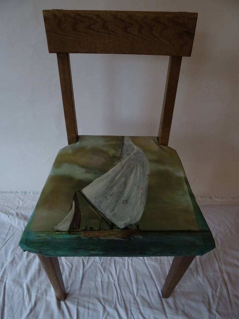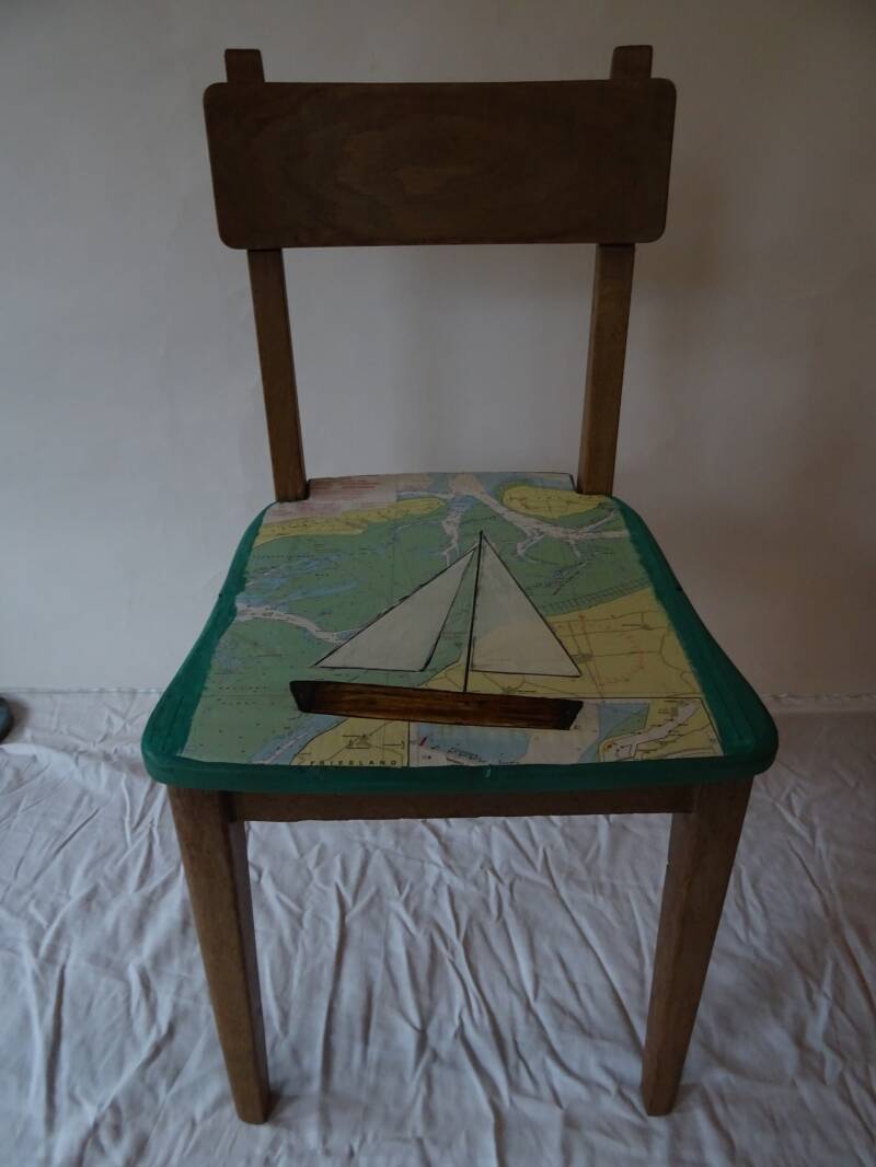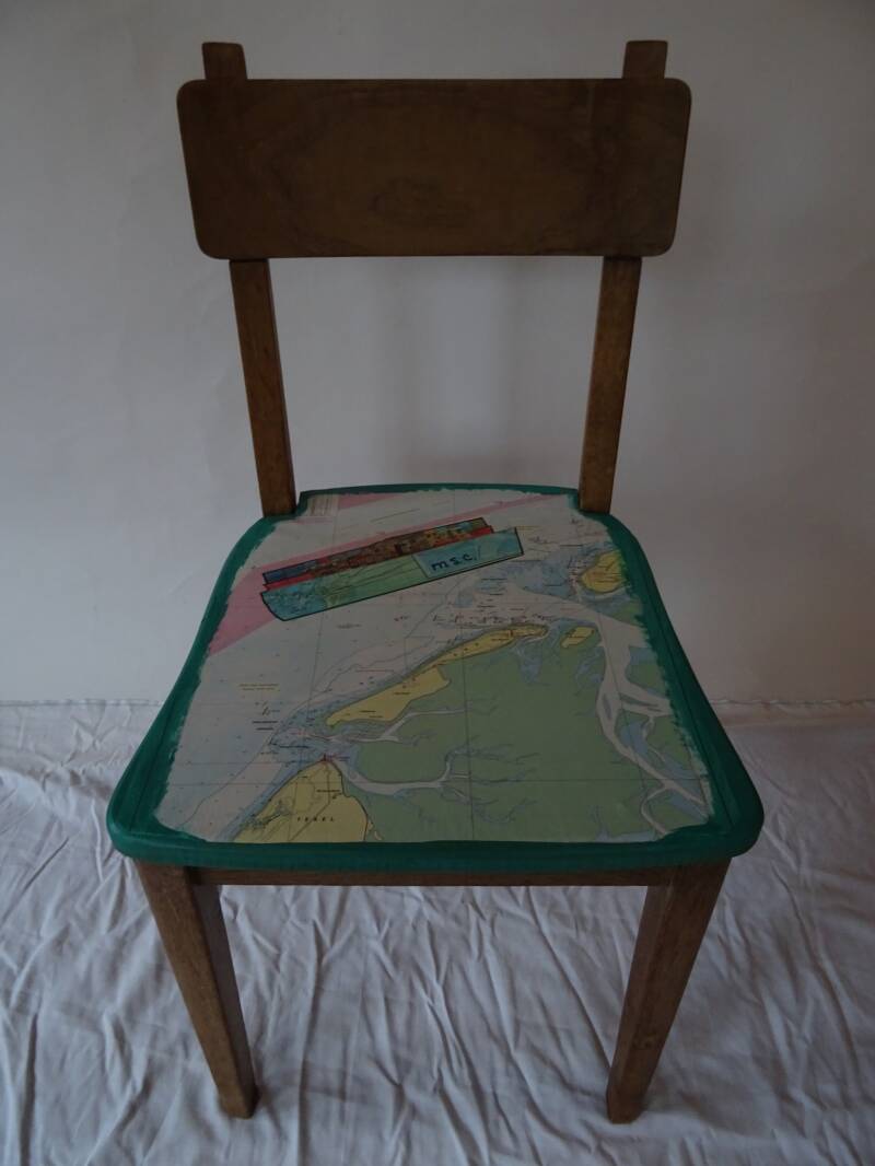 Gebruikte materialen: eiken stoel, beschilderde zeekaart, blanke lak.
