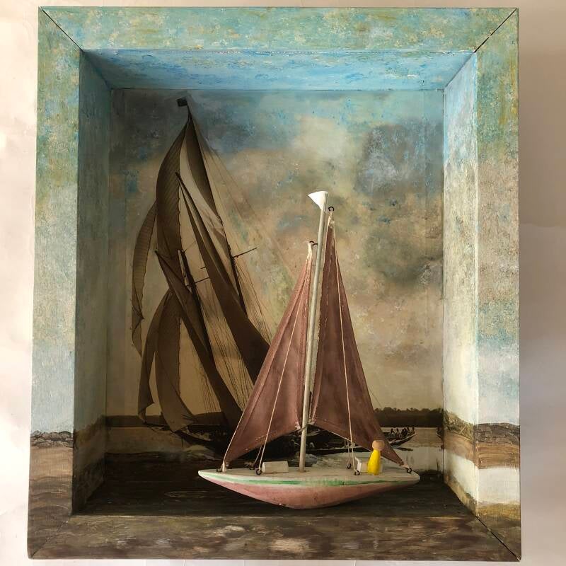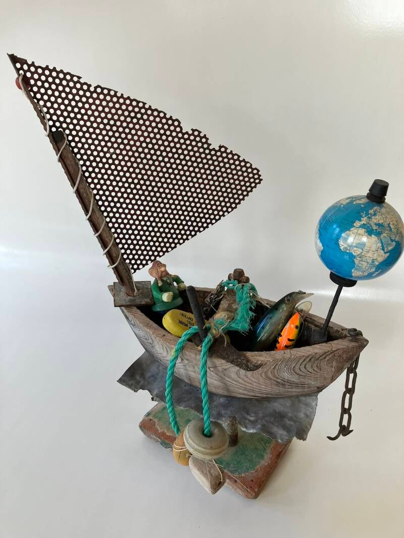 Gebruikte materialen: tegel, lood, bootje, touw, kurk, wereldbol, poppetje, ijzer.